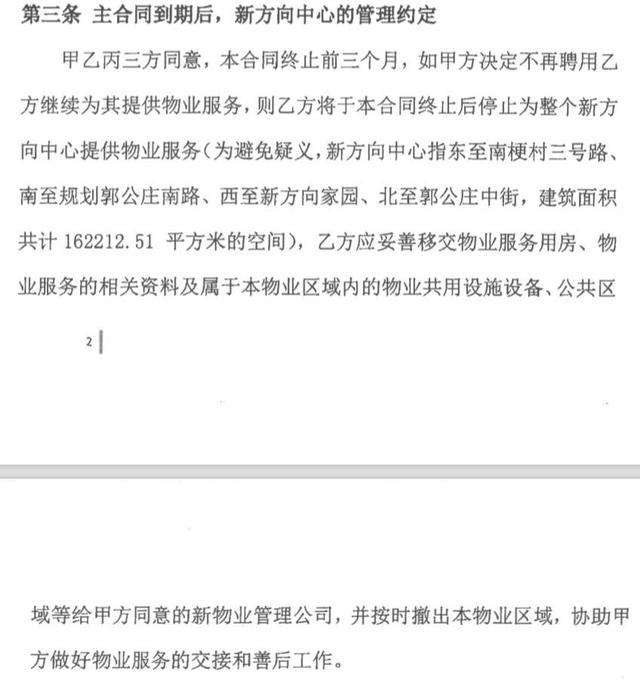据陈辉出示的《物业服务补充协议》显示,物业服务的有效期为2016年1月1日至2017年12月31日。合同终止前三个月,如房天下公司决定不再聘用金隅大成物业继续为其提供物业服务,则金隅大成物业将于该合同终止后停止为整个新方向中心提供物业服务。金隅大成物业应妥善移交物业服务用房、物业服务的相关资料及属于物业区域内的物业共用设施设备、公共区域等给房天下公司同意的新物业管理公司,并按时撤出物业区域,协助房天下公司做好物业服务的交接和善后工作。