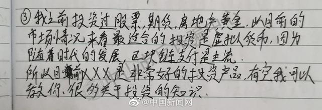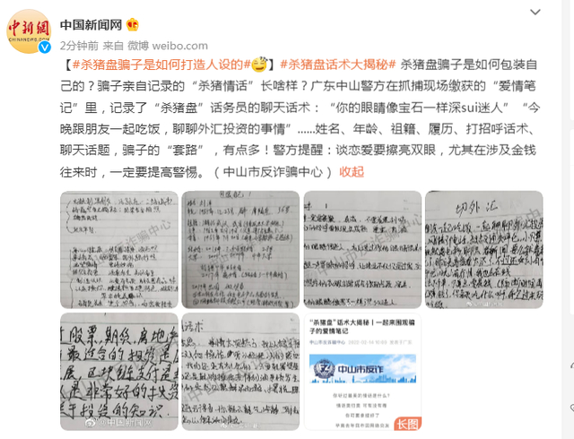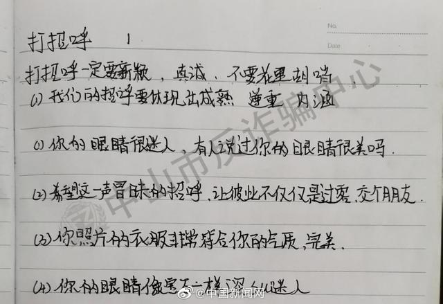 杀猪盘骗子是如何包装自己的?骗子亲自记录的“杀猪情话”长啥样?广东中山警方在抓捕现场缴获的“爱情笔记”里,记录了“杀猪盘”话务员的聊天话术:“你的眼睛像宝石一样深sui迷人”“今晚跟朋友一起吃饭,聊聊外汇投资的事情”......姓名、年龄、祖籍、履历、打招呼话术、聊天话题,骗子的“套路”,有点多!警方提醒:谈恋爱要擦亮双眼,尤其在涉及金钱往来时,一定要提高警惕。(中山市反诈骗中心)