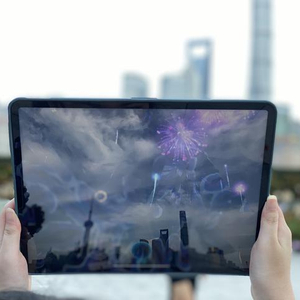 在现场志愿者提前准备好的iPad上轻轻点击粉红色的“MAIC2022”应用程序,iPad屏幕便进入到摄影功能,此时将屏幕举起并对着和平饭店、中银大楼等外滩万国建筑博览群,和平饭店面向外滩一侧的墙壁上,从上而下悬挂起一幅巨大的世界人工智能大会宣传海报。本届世界人工智能大会的吉祥物“威客兄弟”站在外滩广场上,唱起欢快的歌曲。