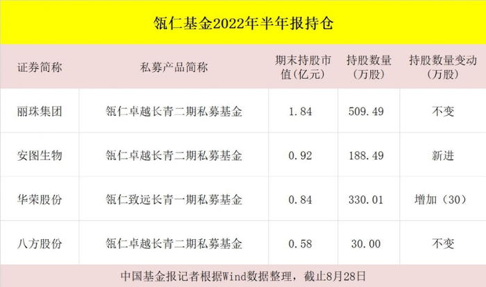 新锐百亿私募瓴仁基金则在今年二季度新进了安图生物,持有188.49万股,期末持股市值近1亿元;同时增持了华荣股份,持有330万股;对丽珠集团、八方股份保持持股不变。