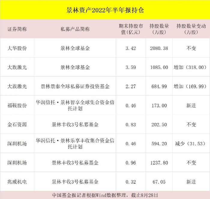 景林资产在今年二季度加仓了大族激光488万股,持有数量为1770万股,期末持股市值达到5.86亿元。同时,景林资产还新进了兆威机电、福鞍股份两只标的,但是持股市值都不大。但是景林略微减持了深圳机场,对大华股份、金石资源等保持持股不变。