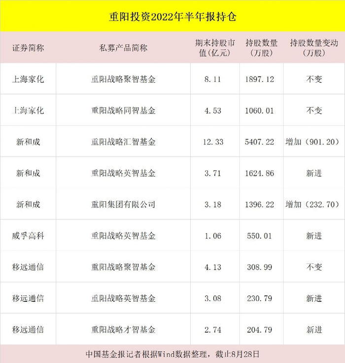 重阳投资二季度大举加仓了新和成,两只基金增持、一只基金新进,合计持有8428万股,期末持股市值达到了19.22亿元;同时重阳也加仓了移远通信,重阳战略聚智等三只基金合计持有744.57万股,期末持股市值将近10亿元。另外,重阳还新进了威孚高科,对上海家化保持持股不变。