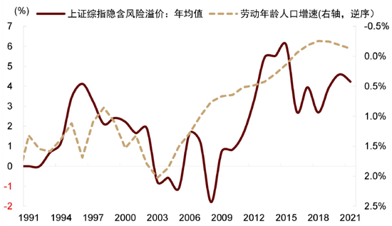 图表:股市风险溢价与我国劳动年龄人口增速长期反向变动