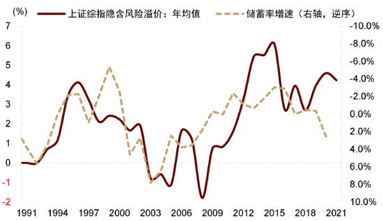 图表:股市风险溢价与储蓄率增速长期反向变动