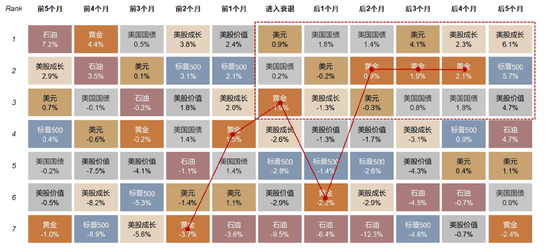 图表:历史上衰退前后大类资产月内收益排序中位数