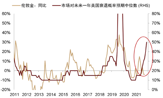 黄金与债券同为避险资产,但黄金受海外宏观形势影响更大。欧美等主要经济体可能正在或即将陷入衰退。在海外经济周期由滞胀向衰退阶段的切换过程中,占优资产一般会由现金逐渐转向黄金,再转向成长风格股票。我们认为当前可能处于占优资产由美元向黄金切换的阶段。