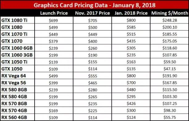 2017年11月至2018年1月8日,各种GPU的价格都有上扬,最右栏是2018年1月估算的过去30天挖矿盈利。