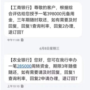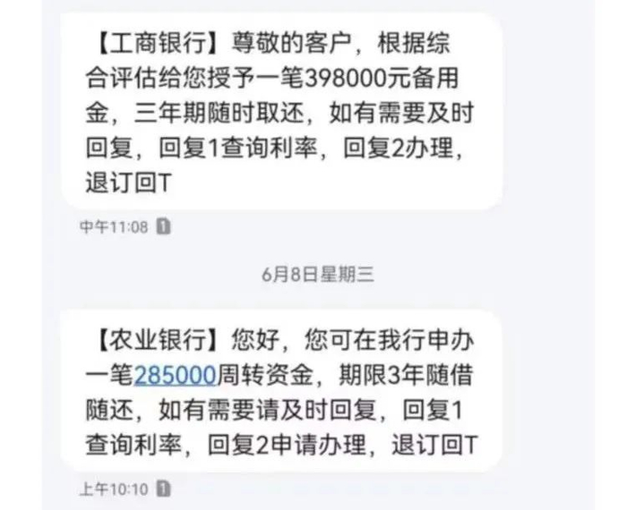 “我接到过太多类似的短信了,农业银行的、工商银行的、建设银行的,全都有。这些短信大多内容相同,都是说我可以申请资金,有30万的,有60万的,只要回复个数字,就能申请或者查利率,有一天闲着没事,就随手回了一个。”