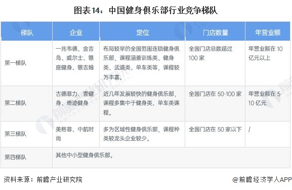 目前我国健身俱乐部行业内第一梯队企业有一兆韦德、金吉鸟、威尔士、银座健身、银吉姆,该类企业门店数量较多,课程种类丰富且全国布局;第二梯队企业有古德菲力、壹健身、奇迹健身,该类企业多集中于健身类、单车类课程,全国门店数量在50-100家;第三梯队企业有美格菲、中航时尚,该类企业多为区域性健身俱乐部。