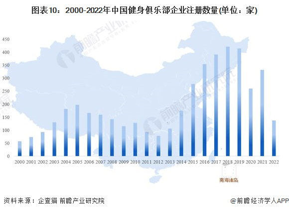 注:数据统计口径说明:1)上述数据均来源于中国企业数据库(企查猫),存在一定的统计误差。2)搜索相关关键词为“健身俱乐部”;3)企业筛选逻辑为:企业的名称、产品服务和经营范围中包含了“健身俱乐部”的企业;行业归类从属于新兴国民经济分类的“健身”。4)统计时间截至2022年7月26日。5)由于中国企业数据库与全球企业数据库不同,存在一定的统计误差;6)图中统计为健身俱乐部在业、存续企业数量。