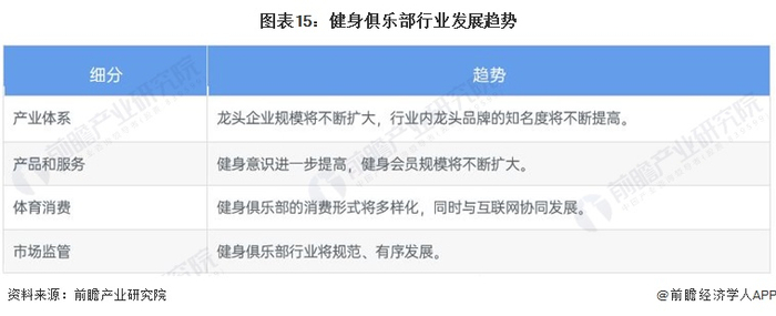 更多本行业研究分析详见前瞻产业研究院《中国健身俱乐部行业市场调研与投资战略规划分析报告》,同时前瞻产业研究院还提供产业大数据、产业研究、政策研究、产业链咨询、产业图谱、产业规划、园区规划、产业招商引资、IPO募投可研、IPO业务与技术撰写、IPO工作底稿咨询等解决方案。