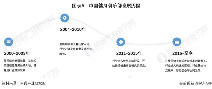 我国健身行业发展子2000年,居民健身意识觉醒,首批知名连锁健身房品牌入场,健身房行业萌芽发展;2004-2010年,健身房数量不断增加;2011-2015年,行业进入优胜劣汰阶段,知名健身房品牌开始不断出现,开始健康商业模式的探索;2016年至今,行业进入快速发展期,并与互联网、智能装备等协同发展。