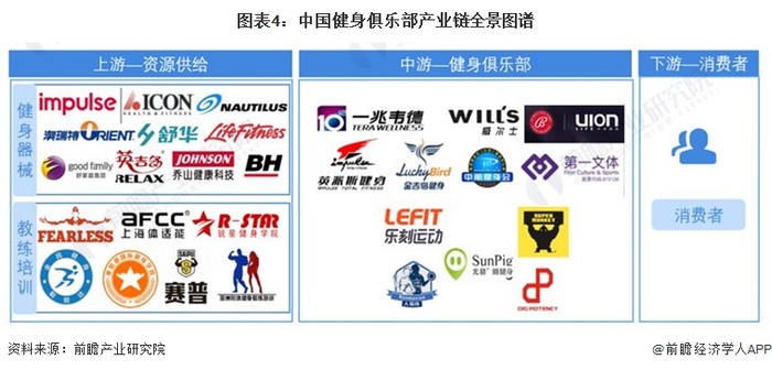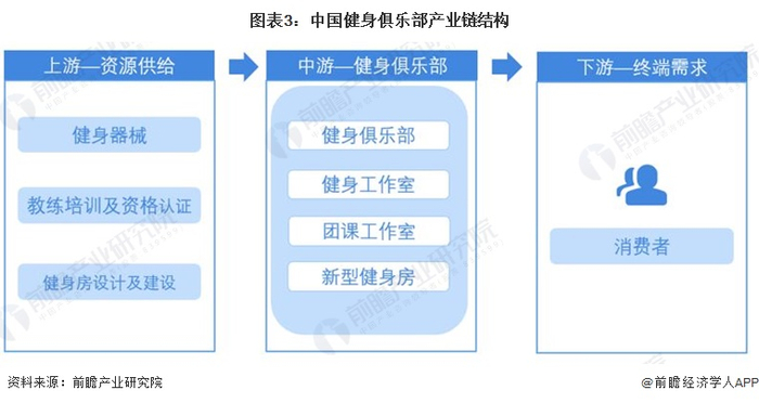 健身俱乐部行业的上游包括健身器械的生产及销售、教练培训及资格认证、健身房设计及建设,即资源供给部分。健身行业的中游为健身服务,主要是各种业态的健身俱乐部;健身俱乐部行业的下游健身消费群体。