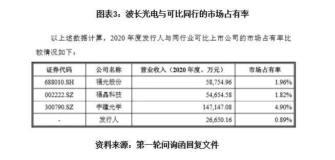 据第一轮审核问询回复文件,波长光电的2020年市场占有率仅为0.89%。