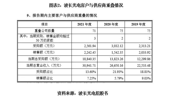 需注意的是,报告期内,波长光电存在客户与供应商重叠的情况。2019年至2021年,重叠公司的数量分别为75家、75家、71家,其中当期采购、销售金额均超过50万元的家数分别为2家、2家、3家。
