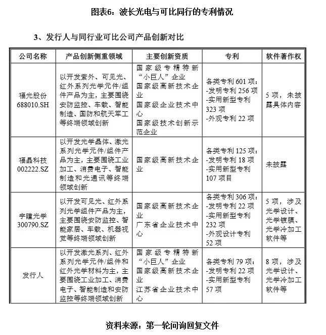 问询回复显示,福光股份拥有专利601项,其中发明专利有256项;宇瞳光学拥有专利306项,其中发明专利有22项;福晶科技拥有专利125项,其中发明专利有18项;波长光电拥有专利79项,其中发明专利有22项。