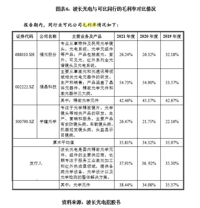 对此,波长光电在招股书中解释称,公司与上述可比同行在产品结构、下游客户、销售市场、应用领域等方面存在一定差异,故毛利率有所差异。