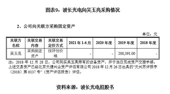 时代商学院发现,2019年,波长光电还向吴玉亮采购设备资产,采购金额为20.04万元。该资产为2018年12月28日波长光电购买吴玉亮持有的设备资产,并于当日完成资产交接手续。上述交易资产已经北京天健兴业资产评估有限公司2018年12月26日出具的“天兴苏评报字(2018)第0137号”《资产评估报告》评估。因此,这一资产设备与前面的采购材料加工服务并不是同一项内容。