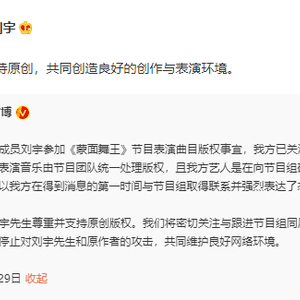 8月29日,针对《2022蒙面舞王》节目表演曲目版权争议,刘宇所在的组合INTO1在官方微博发表声明,否认刘宇侵权:“节目中表演音乐由节目团队统一处理版权,且我方艺人是在向节目组确认版权无异议的前提下完成的表演。”INTO1组合官方微博同时表示,将密切关注与跟进节目组同原作者的后续沟通处理,呼吁大家停止对刘宇和原作者的攻击。