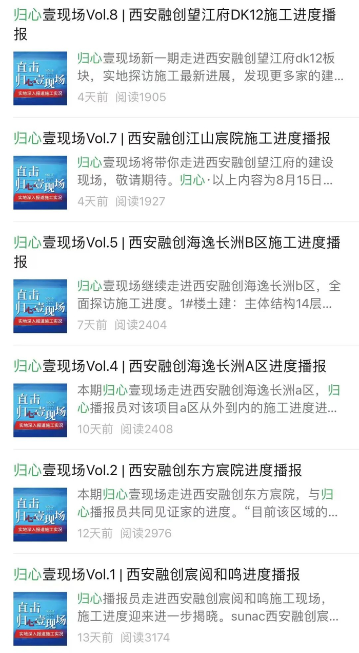 值得关注的是,此前因项目停工而爆雷的西安融创也在8月加紧了施工进度,通过融创西北区域官方订阅号发布了主题为《归心壹现场》活动,针对融创宸阅和鸣、海逸长洲、东方宸院、望江府等楼盘施工进展进行及时通报,截至目前该主题活动已经发布8期,大量施工进展实拍照片也让不少业主悬着的心稍有放松。
