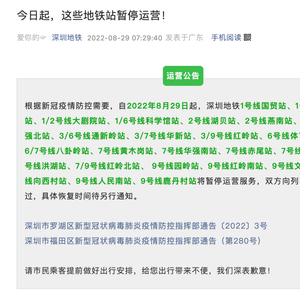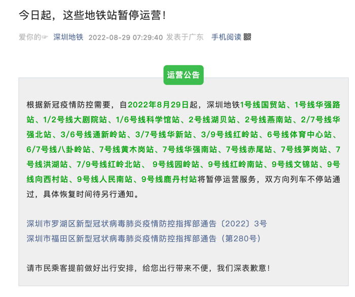 此前,8月29日起,深圳已有24个地铁站暂停运营。据深圳地铁发布运营公告,根据新冠疫情防控需要,自2022年8月29日起,深圳地铁1号线国贸站、1号线华强路站、1/2号线大剧院站、1/6号线科学馆站、2号线湖贝站、2号线燕南站、2/7号线华强北站、3/6号线通新岭站、3/7号线华新站、3/9号线红岭站、6号线体育中心站、6/7号线八卦岭站、7号线黄木岗站、7号线华强南站、7号线赤尾站、7号线笋岗站、7号线洪湖站、7/9号线红岭北站、 9号线园岭站、9号线红岭南站、9号线文锦站、9号线向西村站、9号线人民南站、9号线鹿丹村站将暂停运营服务,双方向列车不停站通过,具体恢复时间待另行通知。