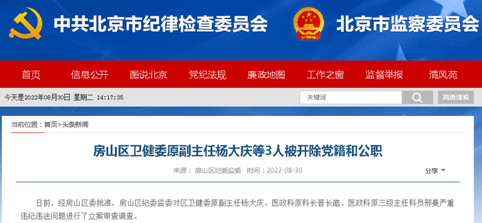 据“清风北京”消息,日前,经房山区委批准,房山区纪委监委对区卫健委原副主任杨大庆、医政科原科长晋长皓、医政科原三级主任科员邢曼严重违纪违法问题进行了立案审查调查。