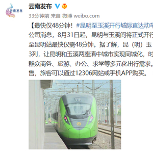 据中国铁路昆明局集团有限公司消息,8月31日起,昆明与玉溪间将正式开行直达城际动车,从云南玉溪站至昆明站最快仅需48分钟。据了解,昆(明)玉(溪)城际直达动车每日开行共3列,让昆明和玉溪两座滇中城市实现同城化,时空距离的压缩极大方便两地人民群众商务、旅游、办公、求学等多元化出行需求。目前,昆玉城际动车车票已发售,旅客可以通过12306网站或手机APP购买。