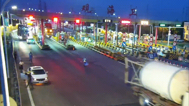 一辆白色小车缓缓驶入收费车道
