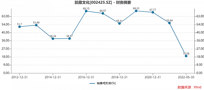 凯撒文化整体销售毛利率断崖式下跌,由2021年的55.84%降至上半年的19.08%。