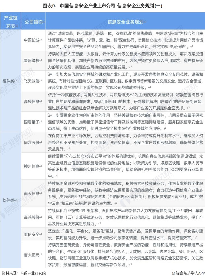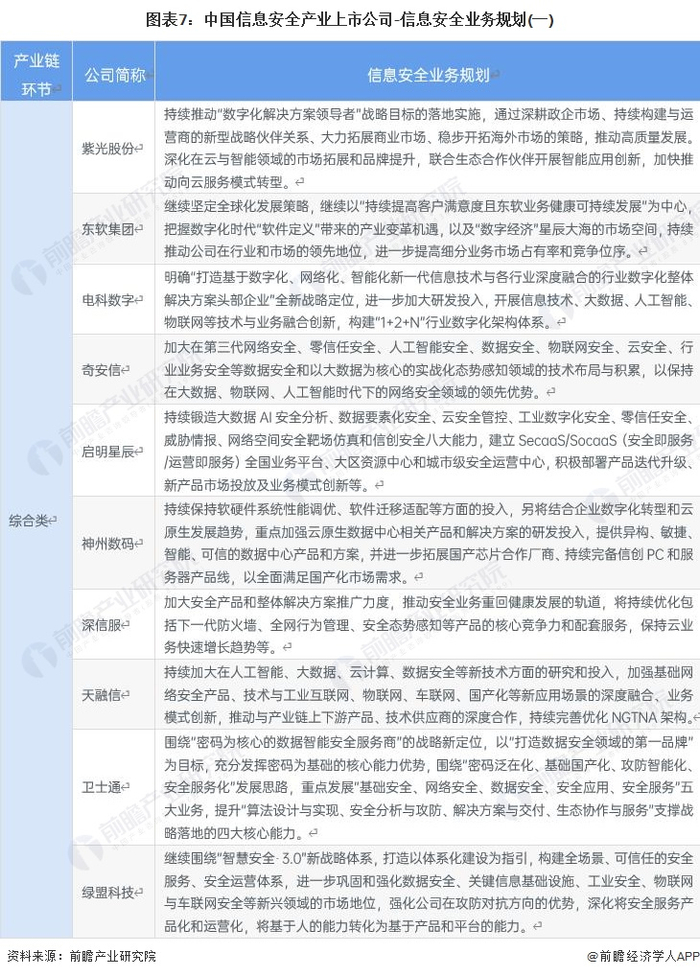根据“‘十四五’规划和2035年远景目标纲要”,“十四五”期间,要培育壮大网络安全等新兴数字产业。建立健全关键信息基础设施保护体系,提升安全防护和维护政治安全能力等规划。此外,信息安全产业的上市公司也明确了其信息安全业务的发展布局: