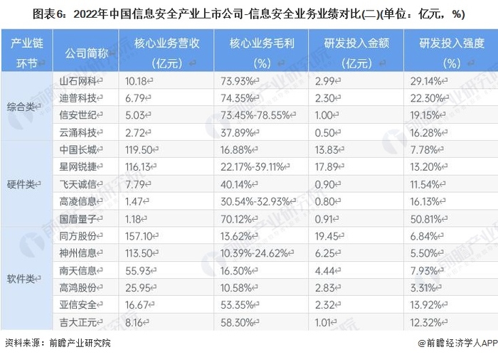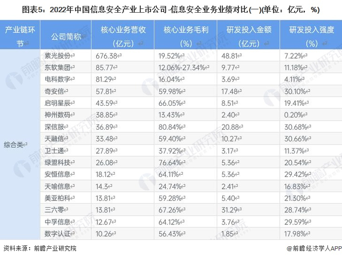 有关信息安全业务的业绩情况,紫光股份(000938.SZ)、同方股份(600100.SH)、中国长城(000066.SZ)、星网锐捷(002396.SZ)的核心业务营收较高;信安世纪(688201.SH)、高凌信息(688175.SH)、星网锐捷(002396.SZ)、东软集团(600718.SH)、神州信息(000555.SZ)等企业的毛利水平较高;研发投入强度以国盾量子(688027.SH)、深信服(300454.SZ)、天融信(002212.SZ)、奇安信(688561.SH)较高。