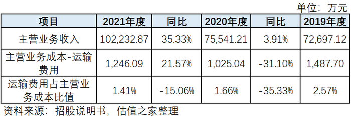 通过估值之家整理的下表可以看到,2021年,公司运输费用占主营业务成本比值仅为1.41%(注:由于公司2019 年度执行原收入准则,故将2019年原计入销售费用中的运输费还原至主营业务成本中列示)。我们再反观可比公司的情况,三威新材同期运输费用占比为6.86%。两相对比,差距不可谓不大。同时,如果一个公司经营情况稳定,客户相对变动不大的情况下,运输费用应该呈现出占比相对稳定,与收入变动趋势基本一致的特征。