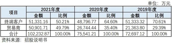 估值之家查阅了相关可比公司的销售模式,均以终端客户为主要客户群体,如:同期递交招股说明书的三威新材,2021年,其贸易商客户占整体收入的19.86%,报告期内贸易商客户收入占比平稳。而发行人佳诺威销售情况却是与行业不同的另一番景象,如下表所示,其贸易商客户销售收入在报告期内实现大跨步增长,从2019年的收入占比约三成到2020年已经占据收入的半壁江山,销售额年复合增长率达54.36%,2021年更是几乎翻倍增长。