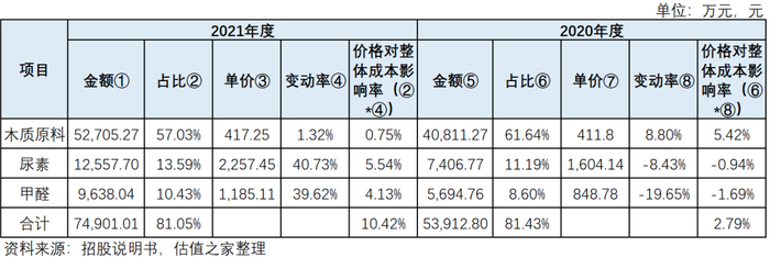 估值之家结合披露的主要原材料采购金额占比和其价格变动相关数据,同时考虑到人造板生产技术相对成熟,其单位产品原材料投入量相对稳定的情况下,大致测算了价格对整体成本的影响率,如下表所示: