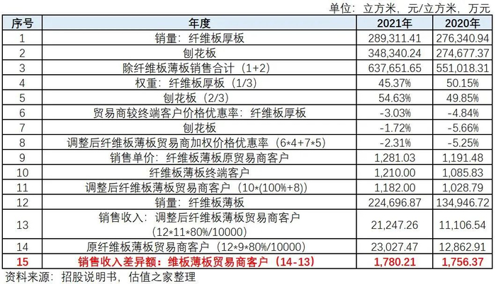 这样厚此薄彼的解释难以让人信服,估值之家有合理理由怀疑,公司可能存在通过虚高的贸易商客户销售价格,达到虚增收入的目的。报告期内,如果按公司其他大类产品对贸易商客户价格优惠的比例和相关销售量来加权测算(纤维板主要采取与贸易商客户合作的模式,因未披露其具体占比,贸易商客户收入按占比80%假设计算),测算过程如下表所示: