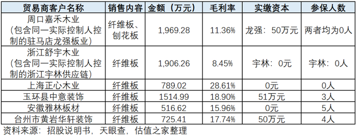 报告期内,公司前五大贸易商客户除排名前二的客户保持稳定外,其他三大客户各年变动情况很大,且大部分为小微企业。天眼查相关资料显示,存在多个客户缺乏实际经营能力的迹象(参保人数为0)或实缴资本较少、信用资质较差的情况(实缴资本小于100万元)。公司与该类客户发生大额业务往来的商业合理性较低,我们整理了相关客户情况如下表所示,涉及销售收入金额达7,421.58万元。同时,可以看到同为采购纤维板,以下前五大贸易商客户毛利率离散度极大,其中:客户上海正心木业为2020 年新增客户,且当年即成为了前五大贸易商客户,其销售毛利率高达28.61%,而同年贸易商平均毛利率仅为17.49%,高出平均毛利率63.58%。在一个产品可选择性丰富,竞争激励的市场,该客户为何还要选择如此性价比不高的产品,其收入存在造假的可能性极高。另外,公司的授信政策也令人费解,一个实缴资本和参保人人数双0的小微企业,发行人竟然给予了200万元授信而不是采取款到发货的销售方式。