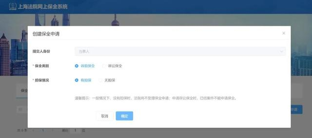☉“保全情况”,若在申请保全前已经完成担保,则选择“有担保”“确定”后进入下一流程;若没有进行担保,则选择“无担保”,根据系统提示自行选择担保方式,在完成担保后再创建保全申请。