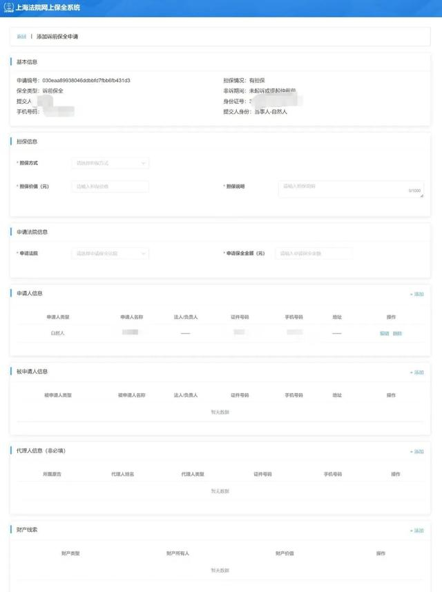 填写诉前保全申请信息: