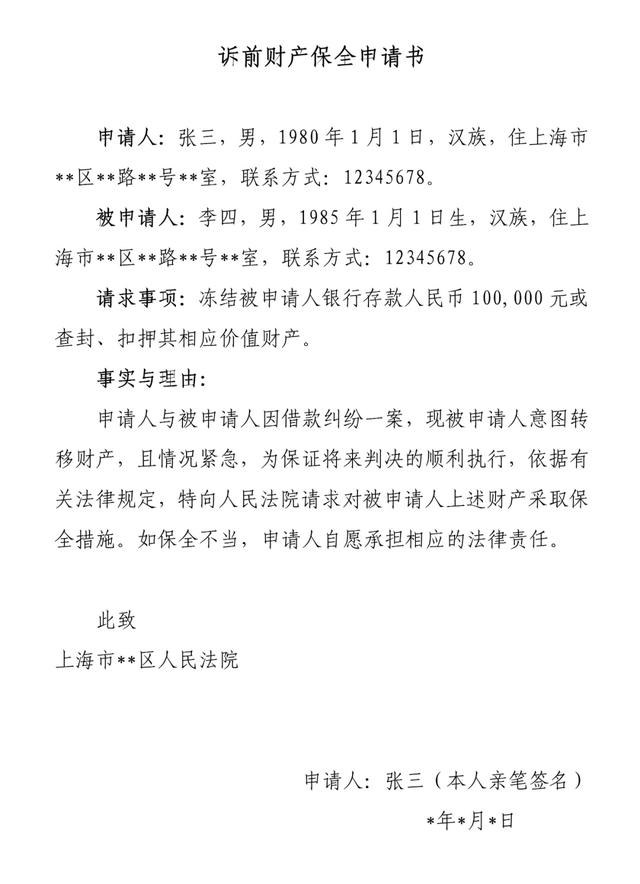 ☉需填写的内容包括:担保信息、申请法院、申请保全金额、申请人信息、被申请人信息、财产线索等。