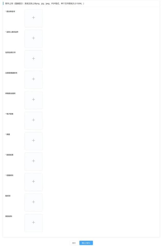 ☉需上传的附件材料包括:保全申请书、当事人身份证件、担保材料、证据材料、起诉状、其他附件等。