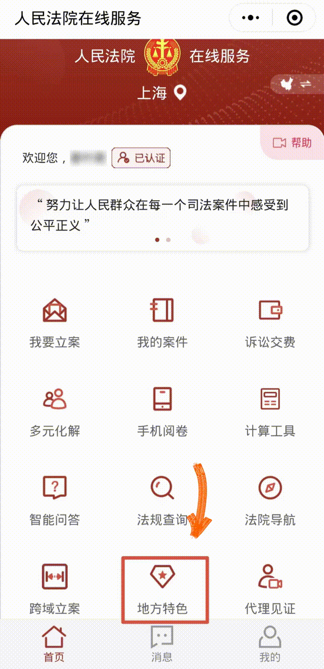 ◇搜索“人民法院在线服务上海”微信小程序,登录并实名认证后,点击“地方特色”,选择“保全中心”进入上海法院网上保全系统。