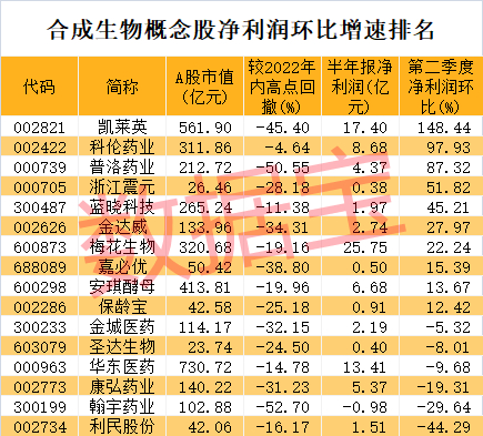 证券时报·数据宝统计,A股市场上具备生物合成业务的公司有16家。从半年报披露的数据来看,上半年半数公司的业绩增长,凯莱英、梅花生物、金城医药等3股净利润翻倍增长。