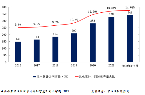 根据能源局统计数据,2022年1-6月份,全国风电新增并网容量 12.94GW, 同比上升 19.37%;其中陆上风电新增并网容量12.06GW,同比上升38.72%。截至2021年6月底,我国风电累计并网容量342.24GW,同比增长17.24%。其中,陆上风电累计并网容量316GW,同比增长12.4%;海上风电累计并网容量26.66GW,同比增长139.53%。