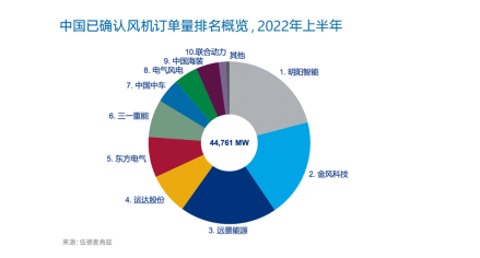 伍德麦肯兹最新发布的《中国风电整机商风机订单量排名:2022年上半年度数据统计及分析》显示,明阳智能以获得超过9GW的新签订单位居榜首,其中包括3.4GW的海上风电订单。