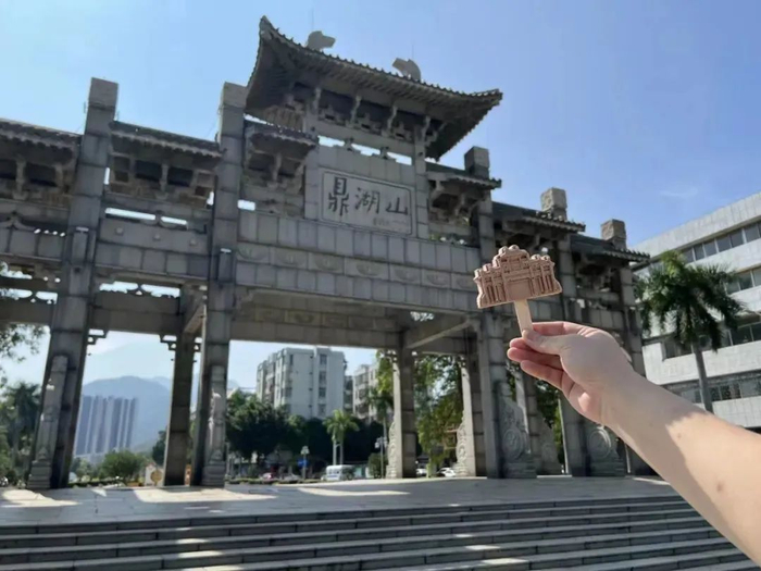 △不少市民游客手持文创雪糕,在肇庆地标建筑前留影,成功解锁“打卡”新姿势。图源 星湖美美