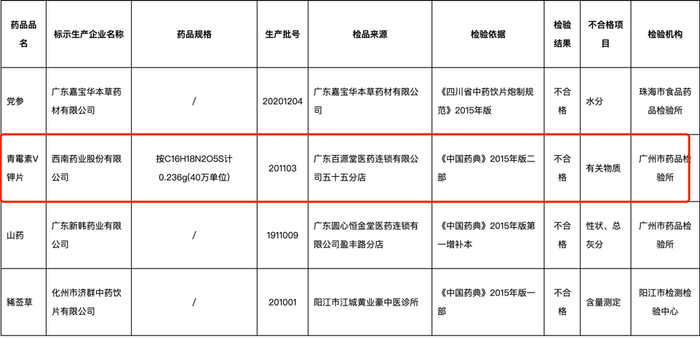 据公告,广东省药品监督管理局于2022年7月29日发布《广东省药品监督管理局关于药品抽查检验信息的通告(2022年第4期)》,其中太极集团控股子公司西南药业股份有限公司(下称西南药业)生产的青霉素V钾片(批号:201103)有关物质检测不合格。