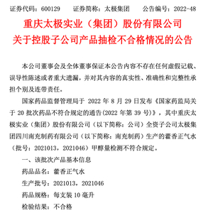 对于该事件影响,太极集团表示,目前藿香正气水在公司及下属企业中,只有南充制药生产销售,2021年度,南充制药生产的藿香正气水销售收入为665万元,占2021年度营业收入的0.05%;本次公告涉及产品销售收入约22万元,占公司营业收入比重极小,无重大影响。