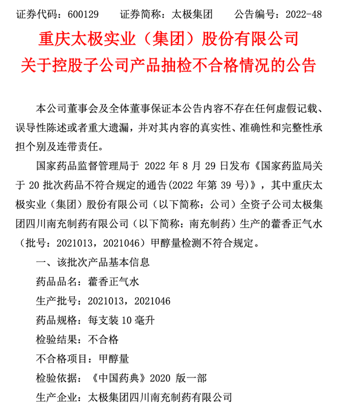太极集团8月30日盘后公告,国家药品监督管理局于8月29日发布《国家药监局关于20批次药品不符合规定的通告(2022年第39号)》,其中公司全资子公司太极集团四川南充制药有限公司生产的藿香正气水(批号:2021013,2021046,有效期为24个月)甲醇量检测不符合规定。