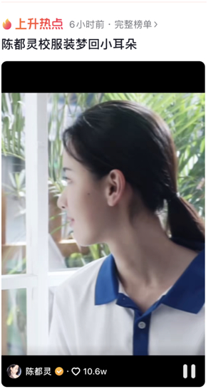 影片中陈都灵对青春的再次演绎,让粉丝、路人“梦回小耳朵”,相关话题#陈都灵校服装梦回小耳朵#在各大平台发酵,掀起一众回忆杀,既让受众回忆到自己的过去,也让用户感受到面对30的力量。