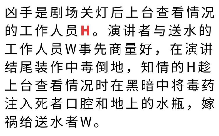 大家有没有发现这个案件有一个非常奇怪的点,为什么凶手要在剧场里杀人?表演才进行到一半,没有人出去也没有人进来,一旦发现尸体剧场就会报警,警察来到就会封锁现场,那凶手不就被瓮中捉鳖了吗?他为什么要让自己处于这样一个被动的环境里呢?
